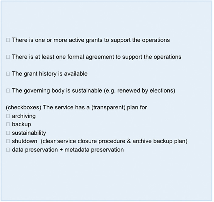 The sustainability plan should address shutdown and archiving matters such as archiving or data preservation.